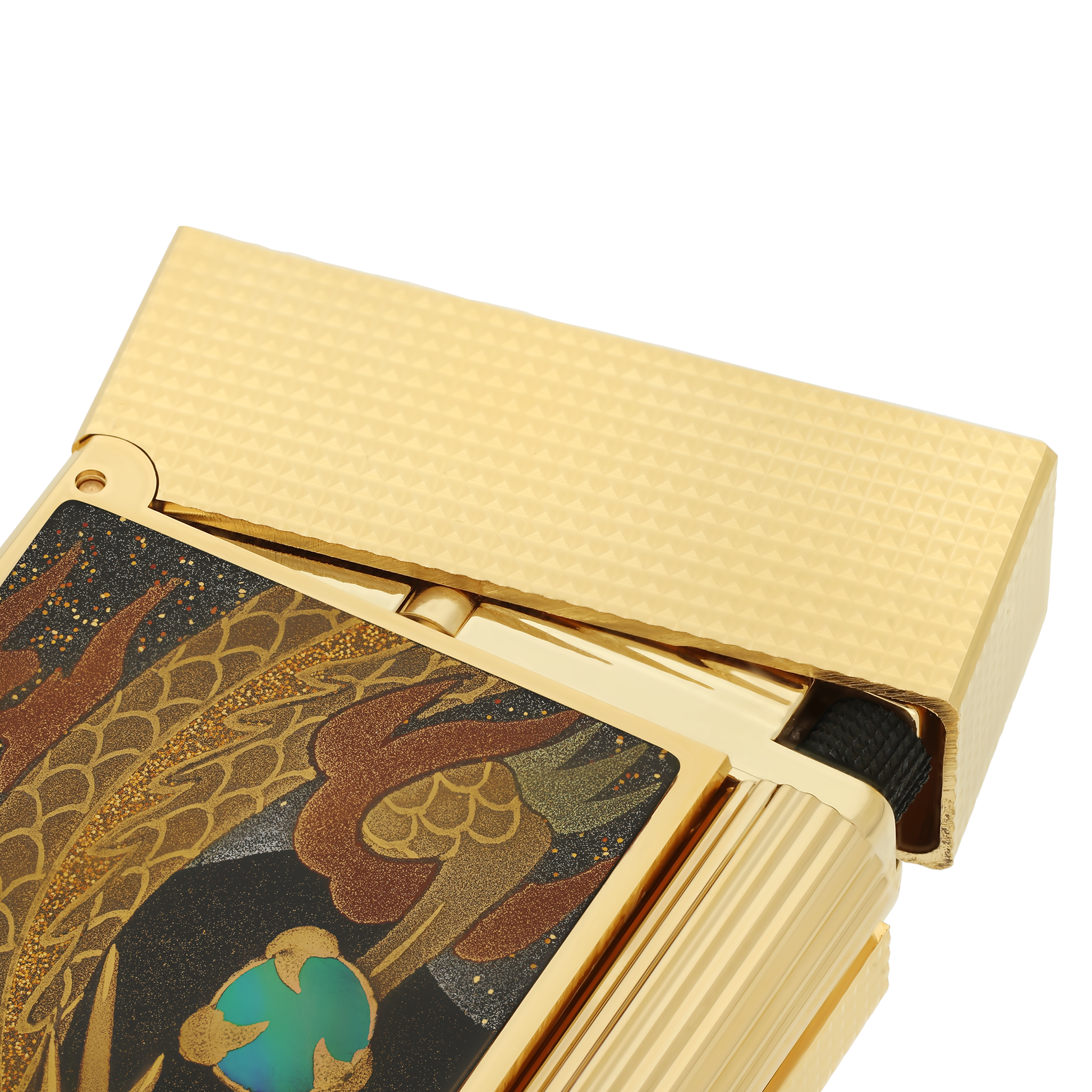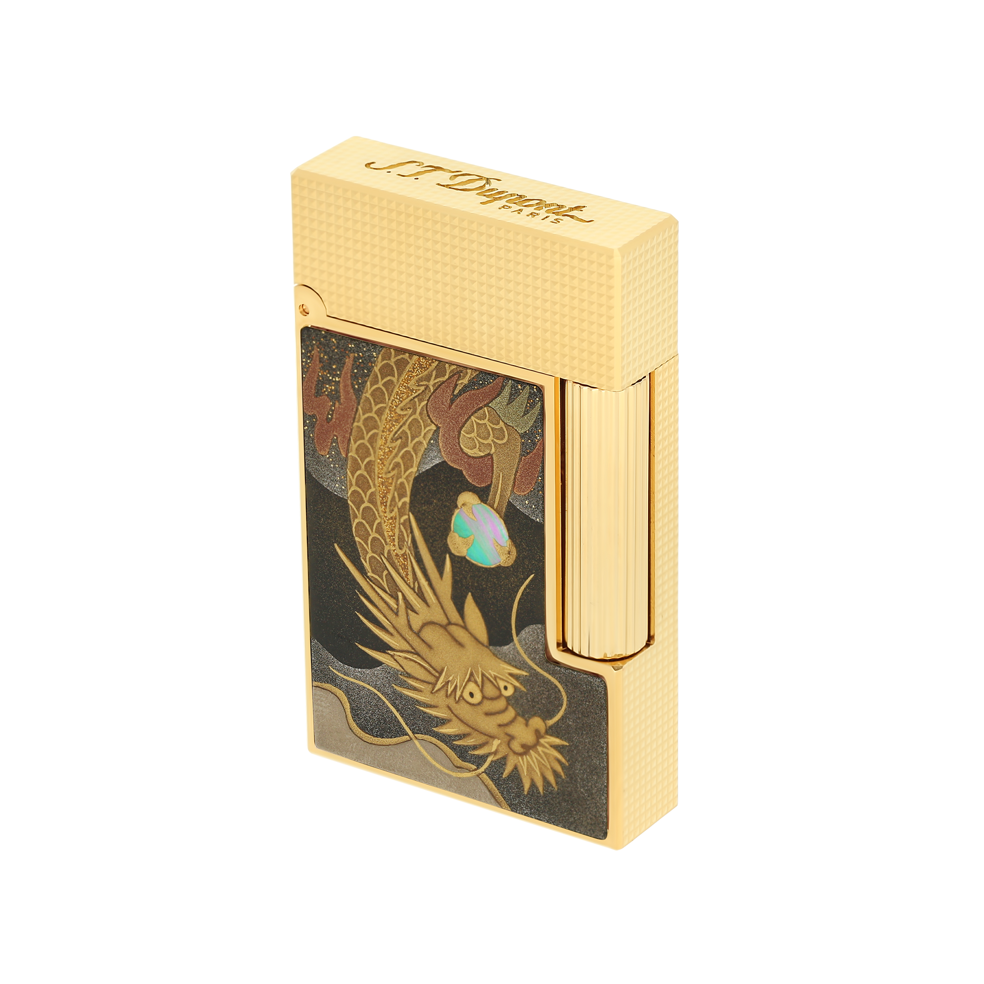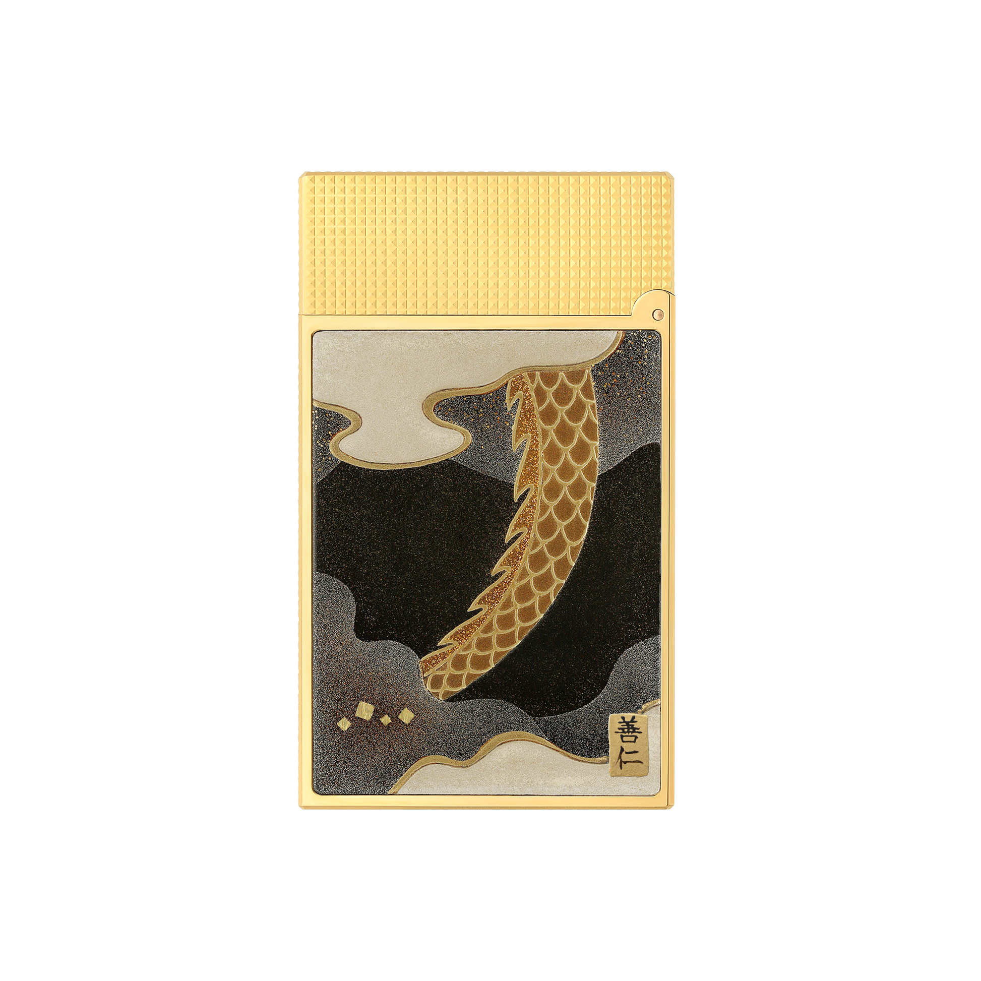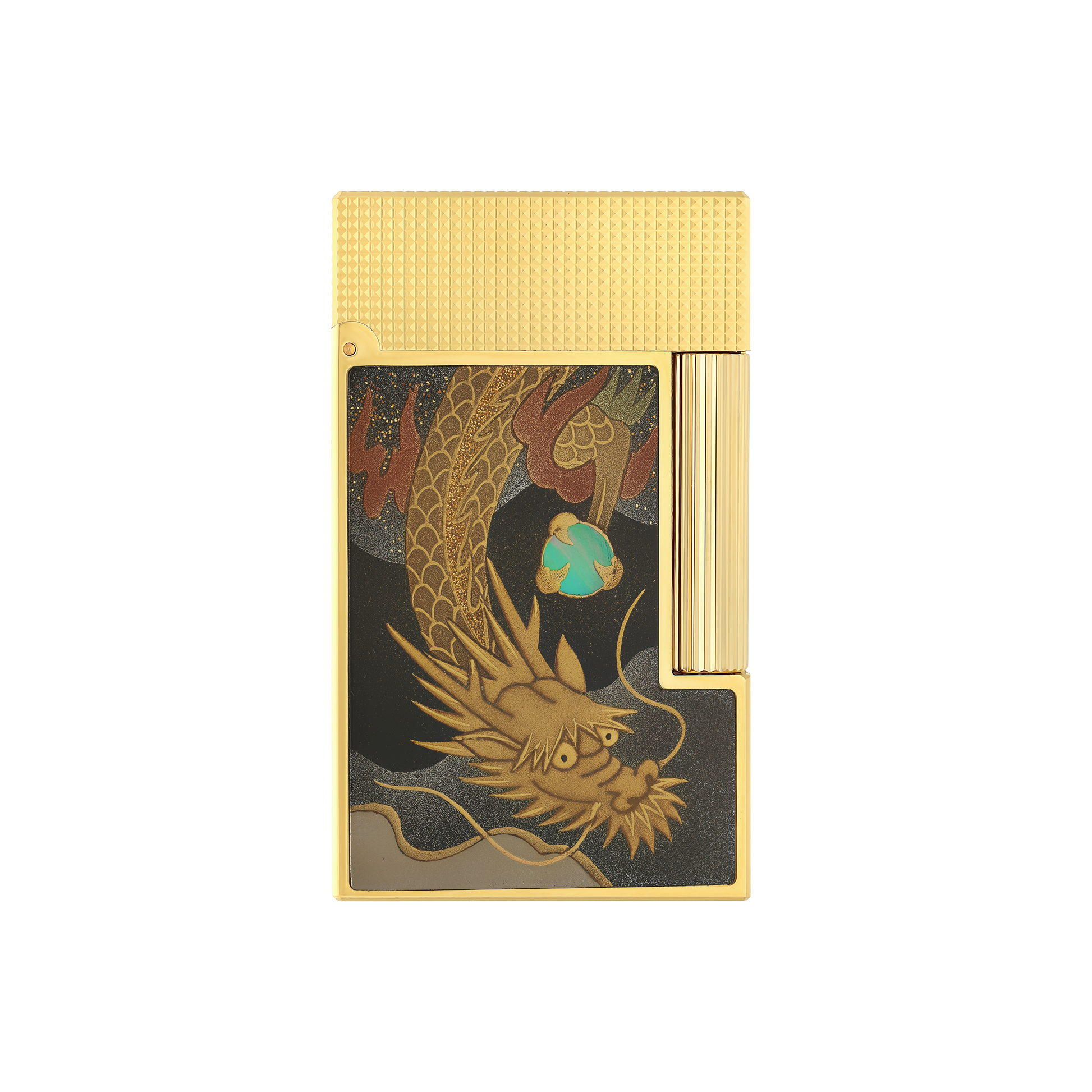 S.T. Dupont celebrates the ancestral Japanese art of Maki-e. Decorated by hand by our partner artisans of Wajimaya Zenni içinde Japan, each piece is adorned ile Altın powder, Paladyum representing traditional Japanese symbols ve signed "Zenni". The Dragon collection symbolizes strength, prosperity ve harmony. Briquet Line 2 Cling pattern Maki-e Dragon decor içinde Altın powder, mother-of-pearl ve Siyah Lake ve Altın Bitişler.Equipped ile a Çift Sarı flame ve the famous "Cling" at the opening. Associated Çakmak flint: Siyah (REF 900601)Uyumlu gaz tüpü: Kırmızı (REF 900435) Çakmak delivered empty of gas, Yedek sold separately.