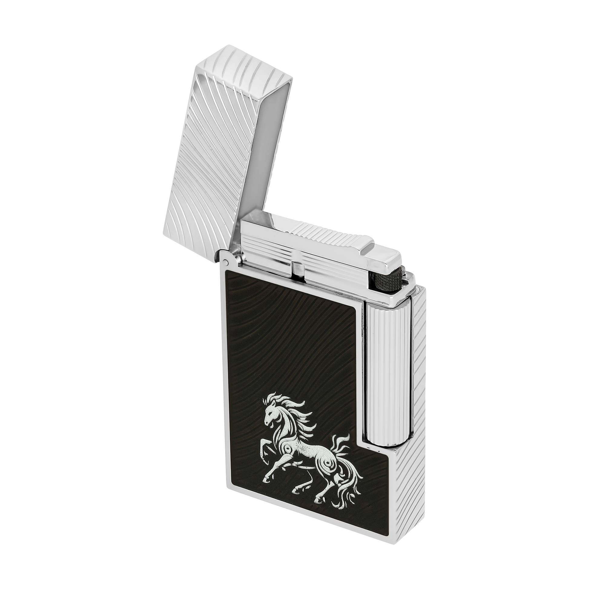 Ligne 2 Cling Çakmak decorated ile guilloché under high-gloss Siyah Lake ile “At yelesi” motif. Fire Horse motif içinde Altın. Paladyum-plated Bitişler.