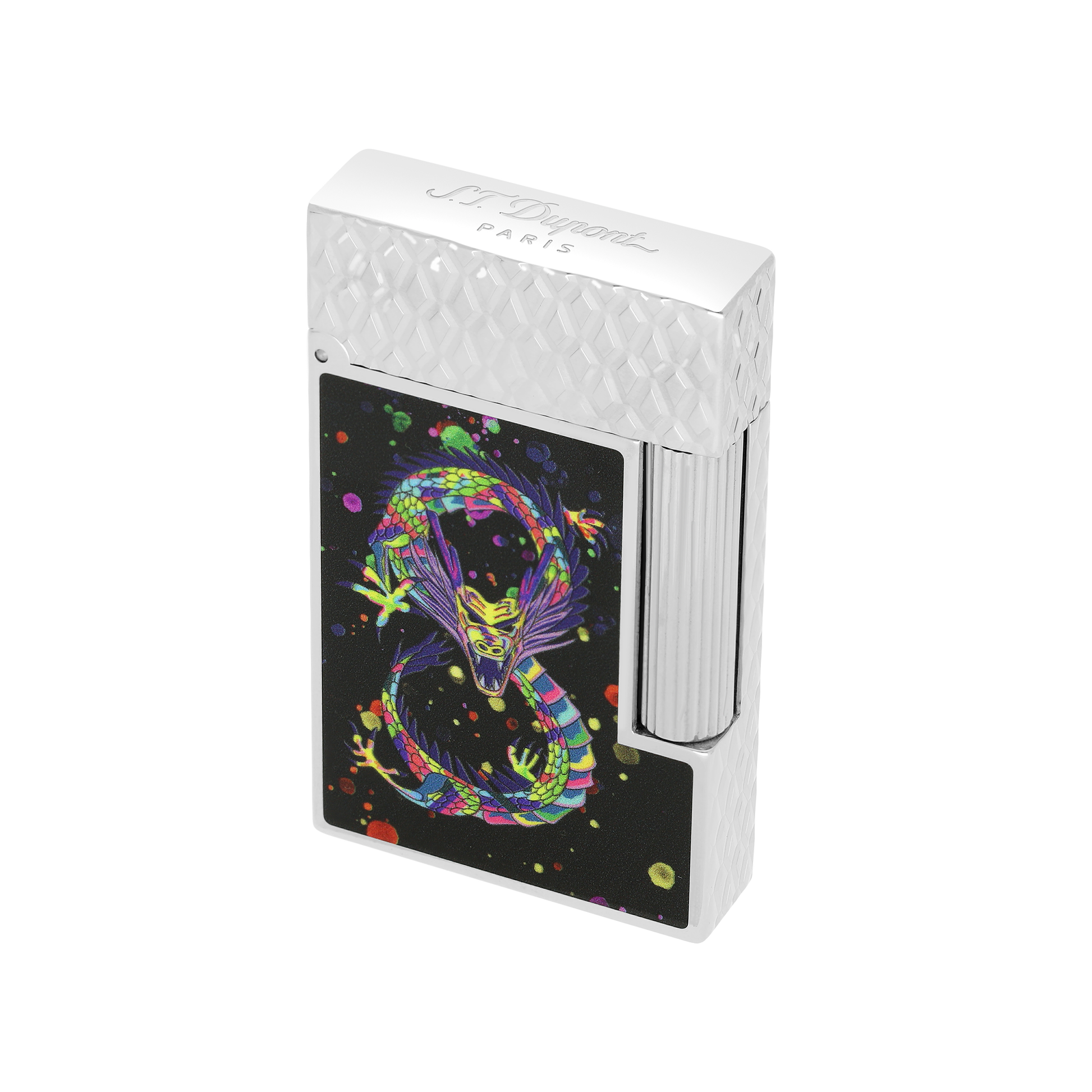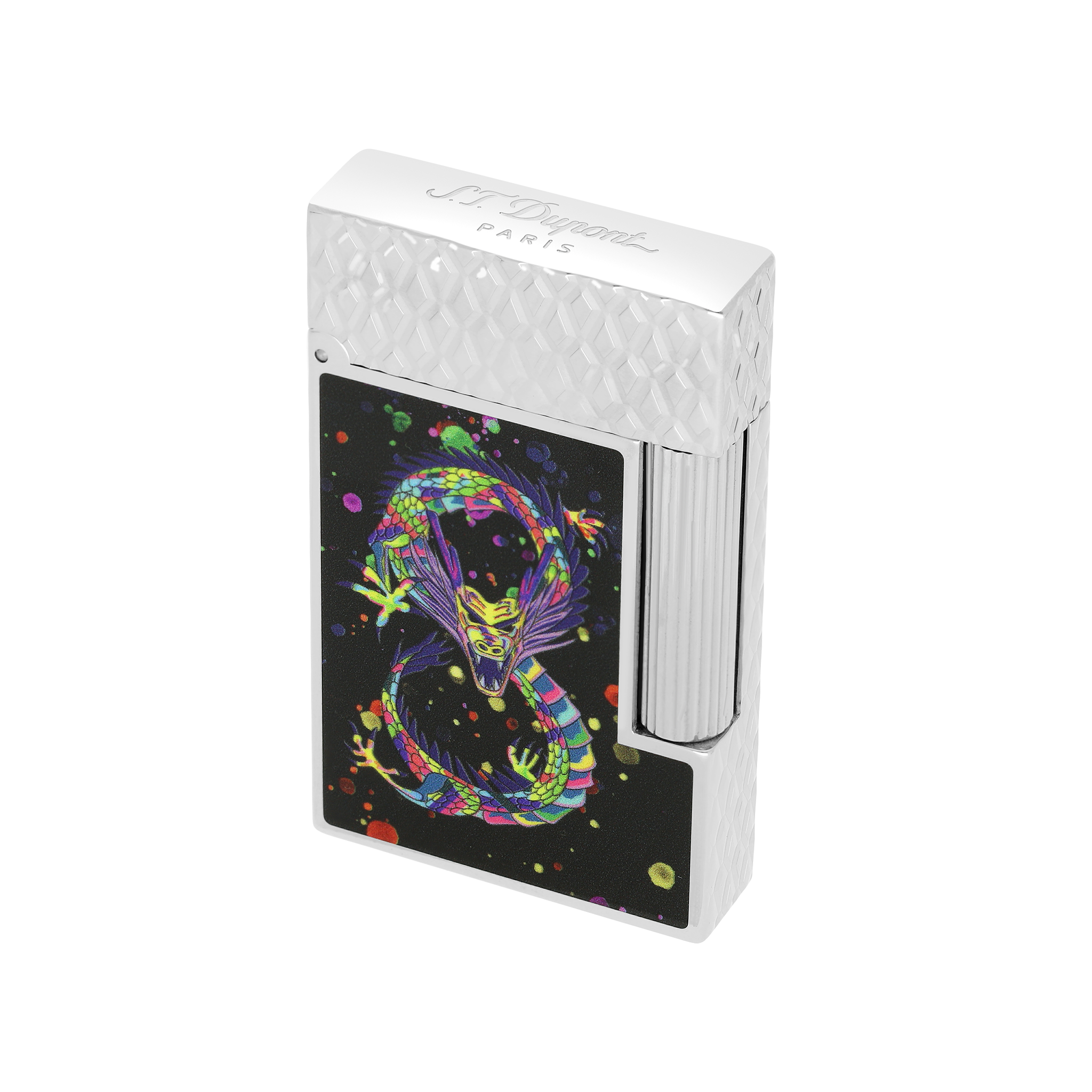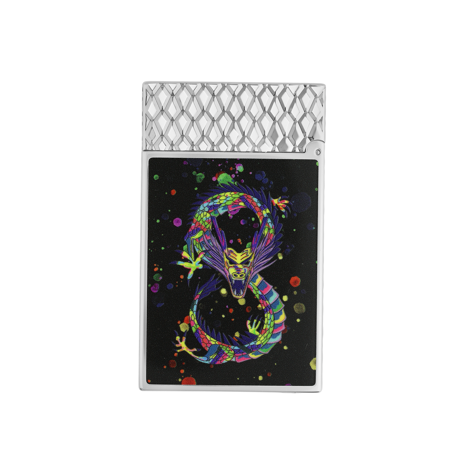 S.T. Dupont's iconic dragon is illustrated on this Siyah Lake ve Paladyum Line 2 Çakmak. Associated refills: Kırmızı (REF 000434) Siyah Stone (REF 900601)