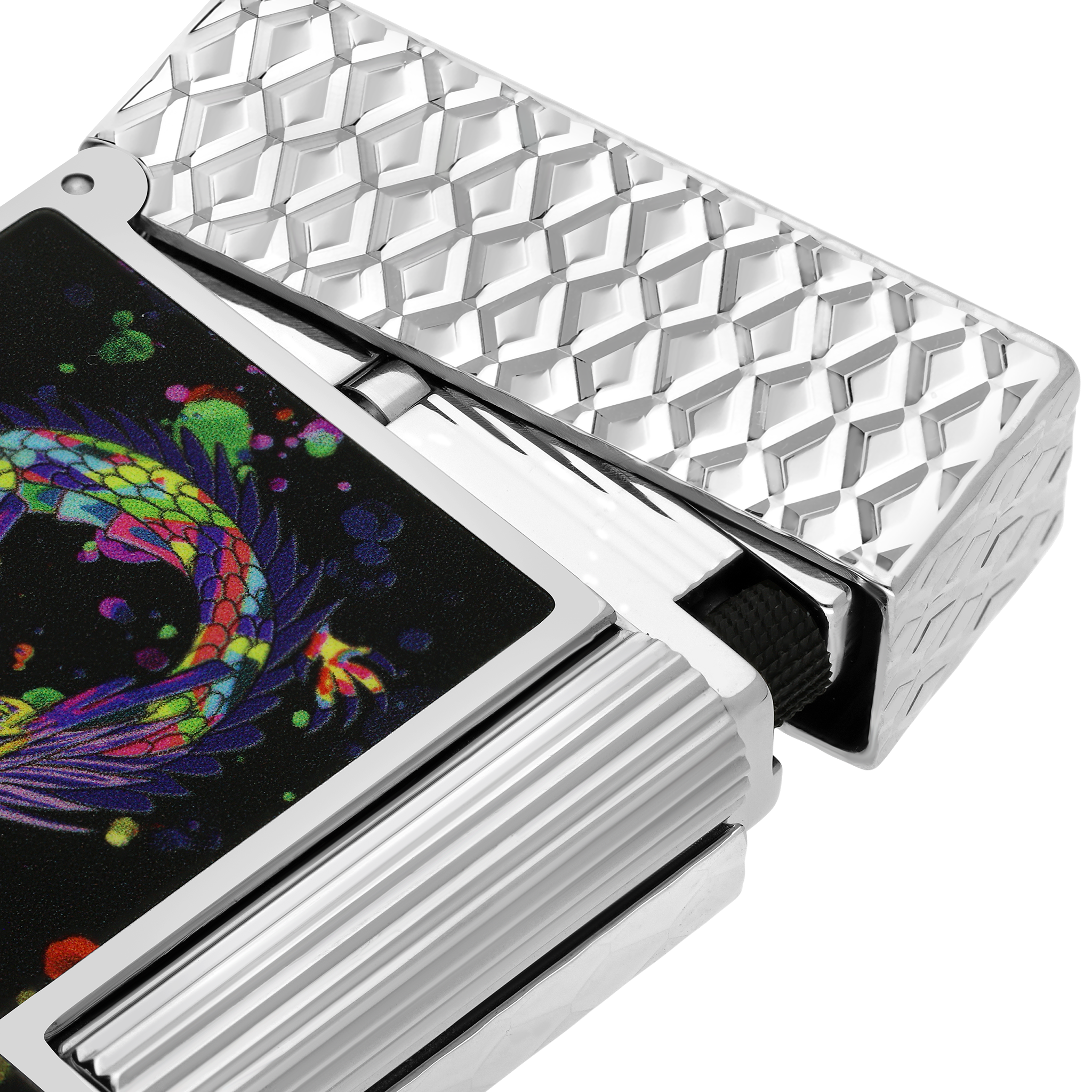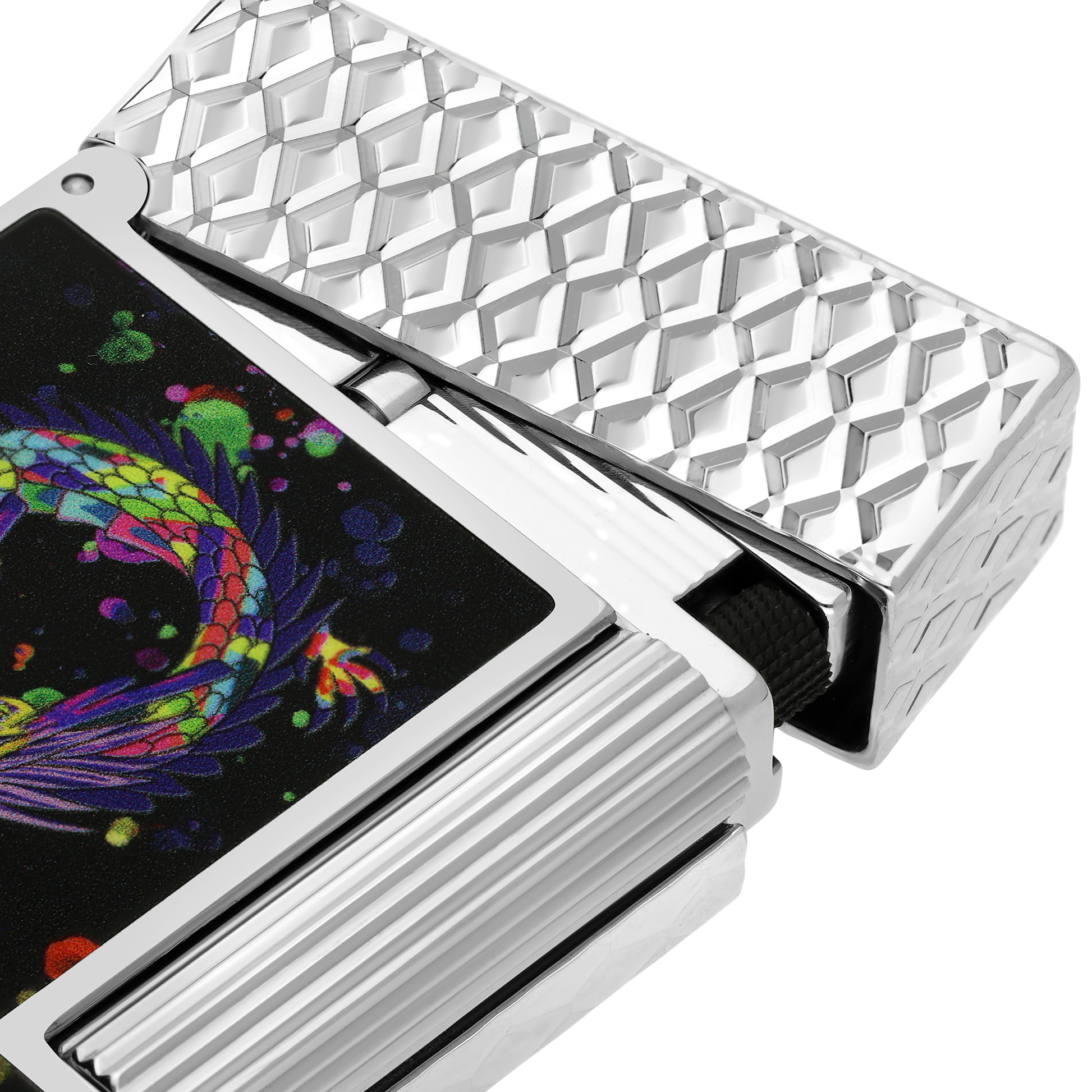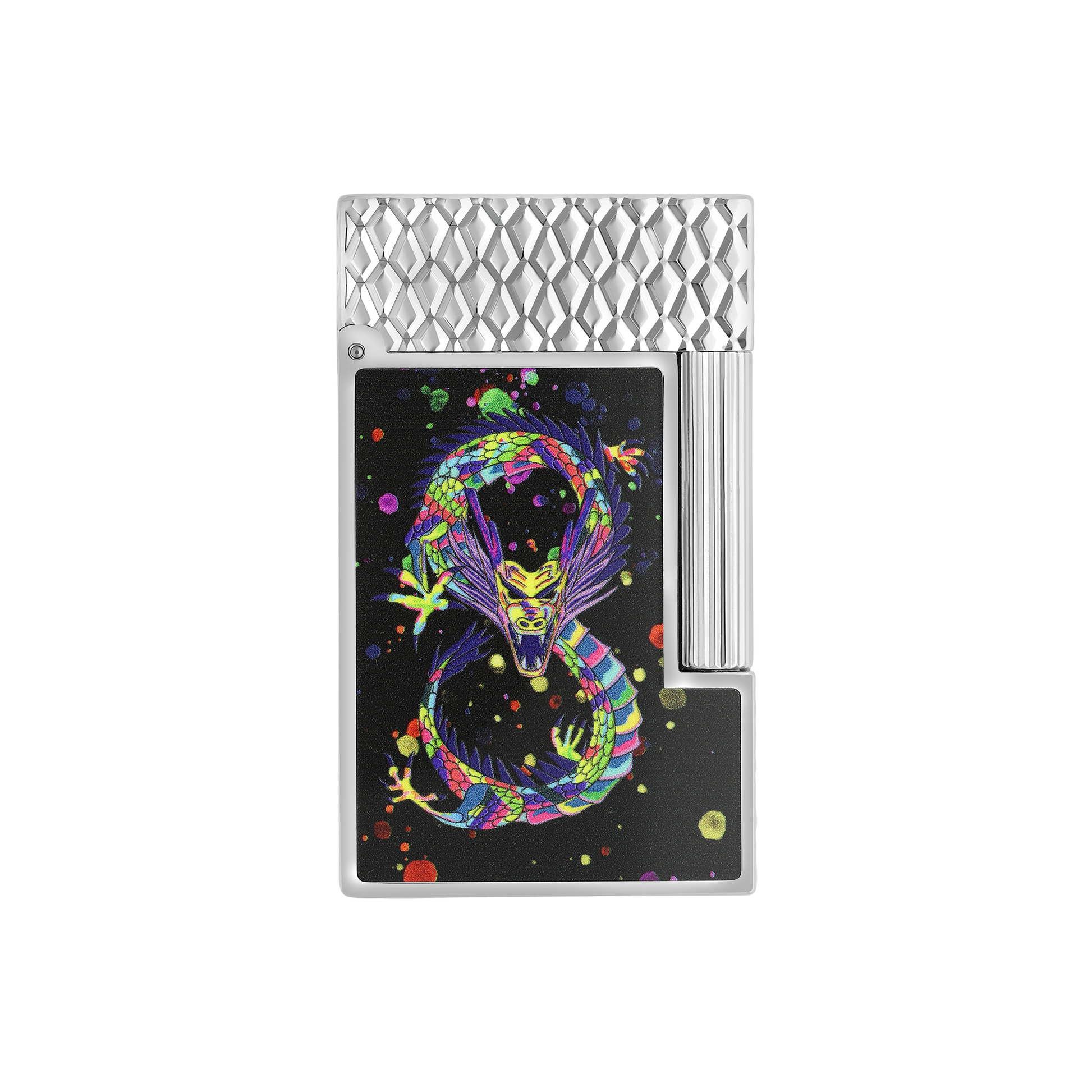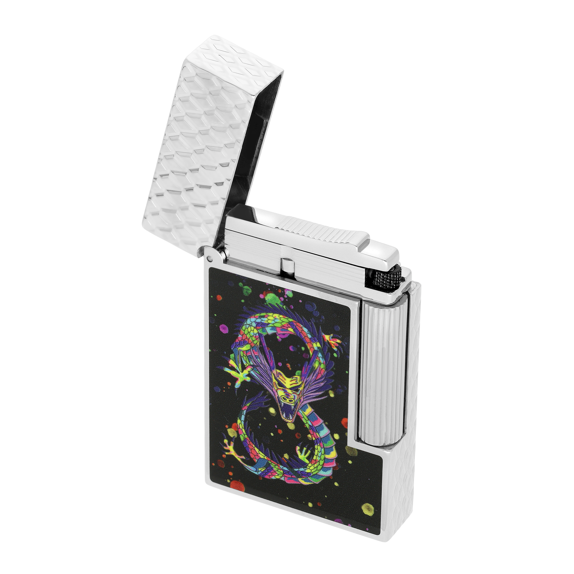 S.T. Dupont's iconic dragon is illustrated on this Siyah Lake ve Paladyum Line 2 Çakmak. Associated refills: Kırmızı (REF 000434) Siyah Stone (REF 900601)